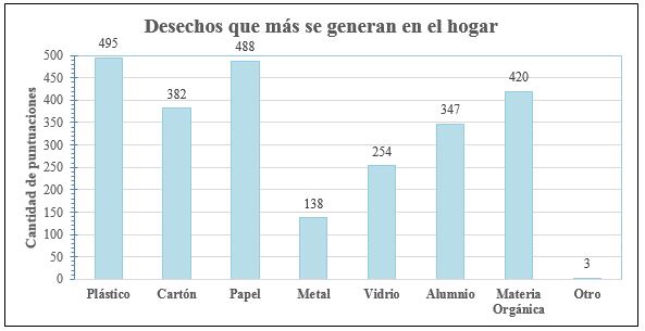 La figura 2 muestra que existe una cantidad considerable de niños y mujeres en la comunidad, los cuales por lo general son quienes más desechos generan. Las mujeres y niños menores de 4 años, por ejemplo, gastan más en papel higiénico y pañales desechables. También, los niños mayores de 4 años generan desechos como aluminio, cartón y plástico debido a las meriendas que llevan a la escuela. Para rectificar el análisis anterior, la sección II de la encuesta se refirió a la generación de los desechos sólidos en el hogar, que consistió en ponderar del 1 al 7 los desechos que más generan, siendo el 7 el desecho con mayor generación. Los resultados se detallan en la figura 3.
