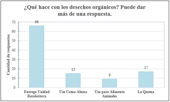 Por su parte, el papel se ha convertido en uno de los insumos básicos del ser humano y se debe prestar importancia a su uso y reciclaje. Cabe destacar que algunas personas encuestadas mencionaron que el denominado “Pampers” era uno de los más desechados. No obstante, en la gráfica se refleja que la materia orgánica también es otro de los desechos sólidos con mayor generación en la comunidad, conformado en su mayoría por desperdicios de comida, cáscaras de frutas y vegetales, desperdicios de cárnicos como huesos y cueros.