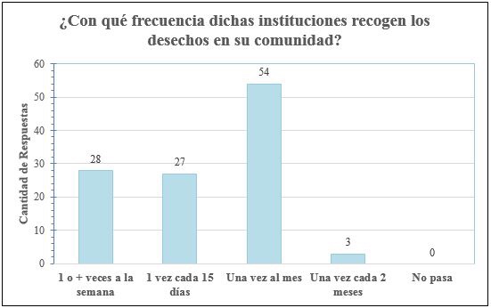 6. La recolección de los desechos que brindan los entes encargados es deficiente e incierta. El 50 por ciento de la población encuestada señala que la recolección la ejecutan entre 1 o 2 días a la semana, mientras el otro 50 por ciento menciona que se efectúa una vez al mes y hasta más allá del mes. Muchos de los pobladores han optado por practicar la quema de desechos y/o desecharlos en vertederos improvisados a las afueras de Veracruz.