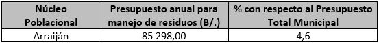 El presupuesto anual de los municipios tiene un porcentaje que va dirigido para la gestión de los residuos sólidos; en el caso del distrito de Arraiján, el presupuesto para el servicio de recolección de residuos es de B/. 85 298,00 lo cual representa un 4,6% con respecto al presupuesto total anual dirigido al Distrito.