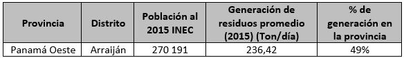 En la tabla 4 se detallan algunos datos actuales del distrito de Arraiján en cuanto a población y generación de residuos sólidos: