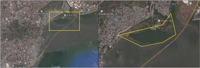 The city of Panama was founded in 1519 by the Spaniards, beside the beach in the area now called Panama Viejo. Many things have changed in this area over the centuries, but something in particular has come to our attention, and mangrove growth that occurred in the last decade in what was once a beach opposite the famous cathedral tower, as this area remained almost unchanged for centuries. So the study focuses on the analysis of the impact that the Corredor Sur’s marine roadway had on the growth of mangroves. They are the main coastal protection against coastal dynamics and natural events such as storms and hurricanes. Man’s actions, pollution and the rapid rise of the sea because of Climate Change, are constantly threatening the mangroves.