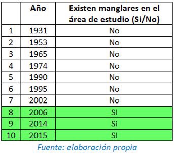 En base a lo observado en las fotografías, se puede concluir que el inicio del crecimiento de los manglares se da entre el 2002 y 2006, poco después de la inauguración del tramo marino del Corredor Sur, y luego se da un crecimiento considerable los años posteriores en el área de estudio.