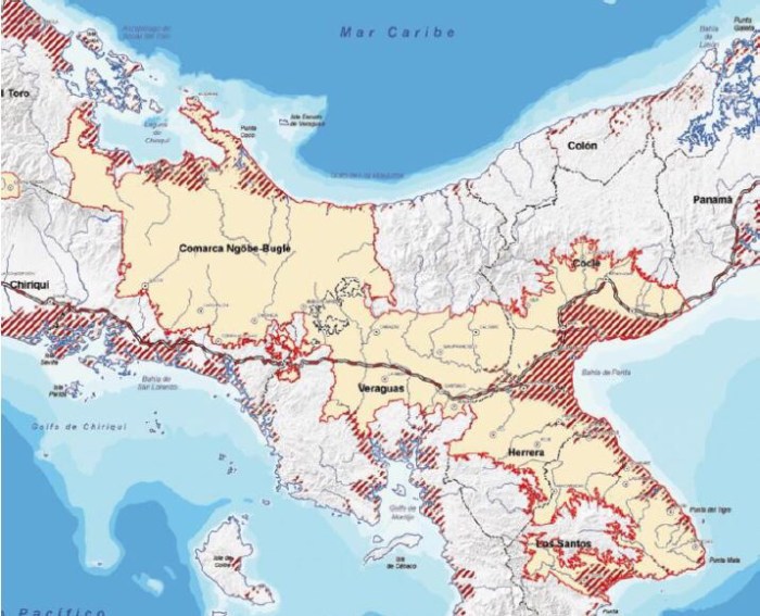 Dado que la región del Arco Seco presenta un clima de sabana tropical y un promedio anual de precipitación de 1 054 mm. En la época lluviosa, se muestran periodos de sequía hasta de 20 días. Los periodos de sequía más prolongados se han presentado coincidentemente con la aparición del fenómeno de El Niño. Los bajos niveles de precipitación registrados están causando una baja significativa en los caudales de los principales ríos de la región y de igual forma, efectos negativos en las áreas de pastoreo utilizadas en la ganadería y la disponibilidad de agua para su uso en actividades agropecuarias, industriales y domésticas. Se observa que el uso de las tierras corresponde a su uso vocacional, por lo que los problemas de degradación de suelos observados, están asociados a inadecuadas prácticas de manejo, como la tala y quema, el sobre pastoreo, otros. (1 Jorge Castillo M. Ana E. Patiño M. Diagnóstico y propuesta de desarrollo sostenible del Arco Seco de Panamá, 2012).