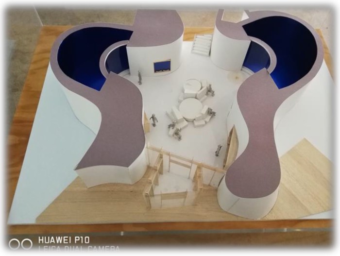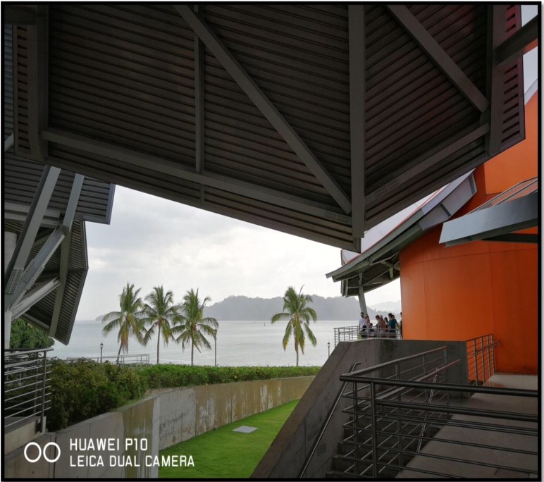 Ascendimos las escaleras y una vez en el vestíbulo, nos recibió una preciosa mujer representante del grupo étnico Guna. La cual nos dió una muy cordial, calurosa y respetuosa bienvenida y nos explicó la razón del diseño arquitectónico con el que cuenta el Biomuseo. Y es que esencialmente se buscó recrear la apariencia de árboles con troncos gruesos y longevos, acompañados de sus grandes doseles, simulando de modo ideal; las caídas naturales de agua lluvia entre las hojas de estos. La idea del diseño edilicio se concibió tan pura en su esencia; que se pudo observar nidos de aves, en áreas estratégicas de las vigas que sostienen los tejados.