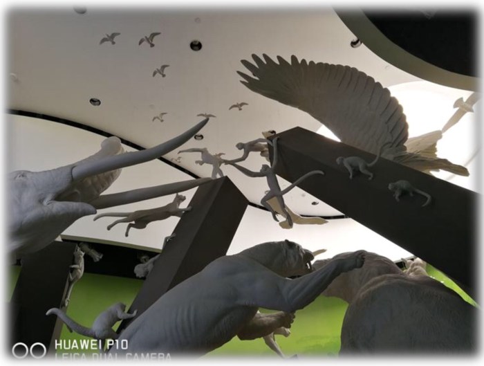 En la galería El gran intercambio me cautivó la genialidad en cómo plasmaron de forma tan creativa y comprensible para todos, la dinámica experimentada por las especies de los hemisferios norte y sur, a su paso por el istmo de Panamá, se me hizo demasiado brillante, la idea de situar las réplicas de dichas especies en direcciones que obedecían sí al norte o al sur en su tránsito. ¡Verdadera genialidad!