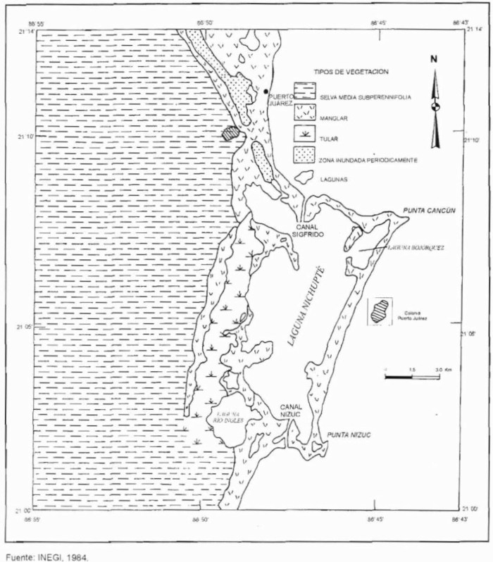 El clima predominante es tropical subhúmedo con lluvia intermedia, temperatura media anual superior a los 22°C y una precipitación al año de 1000 mm que se concentra entre mayo y octubre, con máximos en junio y septiembre. Las costas de Quintana Roo son afectadas por perturbaciones atmosféricas fines de verano y principio de otoño. El área de la zona predomina las especies Rhizophora mangle y Avicennia germinans.