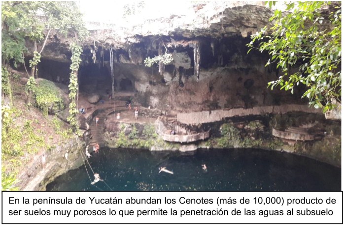 Figura 10. En la península de Yucatán abundan los Cenotes (más de 10,000) producto de ser suelos muy porosos lo que permite la penetración de las aguas al subsuelo.