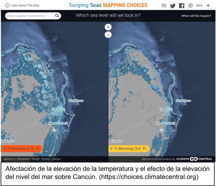 Afectación de la elevación de la temperatura y el efecto de la elevación del nivel del mar sobre Cancún. (https://choices.climatecentral.org)