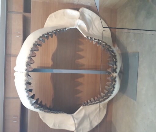 Lo que me encontré en la tiendita, y no precisamente para comprar, la mandíbula de un gran pez, de un tiburón, el más grande que se haya conocido en la historia; lo tenían acampando aquí mientras terminan de remodelar el área donde lo tendrán en exhibición. Cuenta la historia que medía más de 16 metros de longitud.
