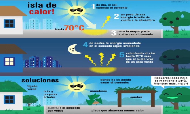 “La isla de calor es una situación urbana de acumulación de calor por los materiales que se utilizan para construir en las ciudades (asfalto, cemento, etc.). Por la noche, estos materiales se desprenden muy lentamente de calor que captan durante el día, lo que aumenta las temperaturas nocturnas”. (Deteea.es, 2017).