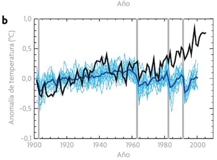 Figura 3. Comparación entre las anomalías de la temperatura global media observadas (líneas negras) y las simulaciones con modelos climáticos forzadas con (a) los factores naturales y antropogénicos (58 simulaciones de 14 modelos diferentes, líneas amarillas, y la media de todos ellos, línea roja); y (b) solo los factores naturales (19 simulaciones de 5 modelos diferentes, líneas azul claro, y la media de todas ellas, línea azul gruesa).