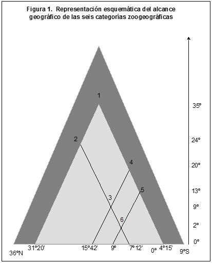 Las categorías zoogeográficas son: 1. En toda la Provincia PacíficoPanameña; 2. Especies norteñas con límite sur en Panamá (31o20′ 23o20′ N a 7o12′); 3. Especies norteñas con límite norte en Chiapas, El Salvador, o Nicaragua y sur en Panamá (15o42′ N a 7o12′ N); 4. Especies sureñas con límite norte en El Salvador o Nicaragua y sur en Perú o Ecuador (4o15′ S); 5. Especies sureñas con límite norte en Panamá o Costa Rica y sur en Perú o Ecuador; 6. Especies endémicas de Panamá; 7. Especies que se distribuyen en más de una provincia malacológica (figura 1). Se han señalado, aparte, las especies cuyo primer registro para Panamá proviene del material objeto a estudio.