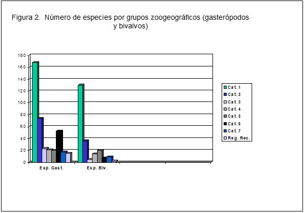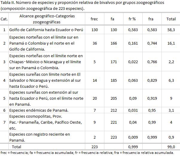 El número de especies y las proporciones relativas de las mismas en estos grupos zoogeográficos se muestran en las tablas I y II. Alrededor del 58% de los bivalvos y el 43% de los gasterópodos se distribuyen a lo largo de la Provincia PacíficoPanameña (categoría 1). Aproximadamente el 18% de los bivalvos y el 24% de los gasterópodos son especies norteñas exclusivamente, con límite sur en Panamá (categorías 2 y 3). Cerca de un 10% de los gasterópodos y poco más del 15% de los bivalvos son especies sureñas (categorías 4 y 5) aunque, de estos, un 5,4% de gasterópodos y un 6,3% de los bivalvos tienen como límite norte El Salvador o Nicaragua (categoría 4).
