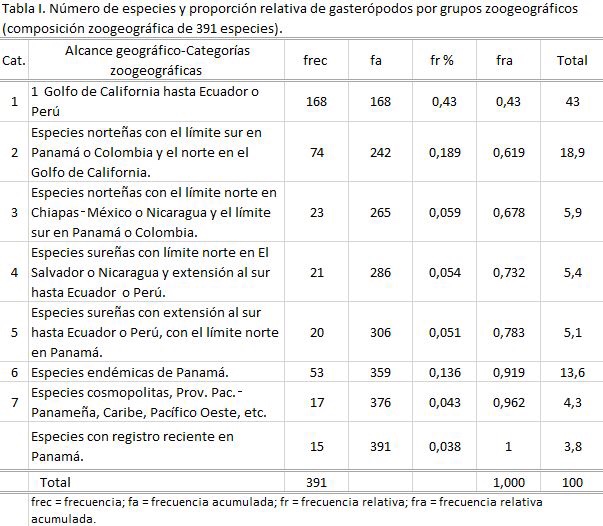 Las categorías zoogeográficas tratadas se ven justificadas por el número de especies de cada una y los límites establecidos para las mismas. De los gasterópodos, 170 especies (43,5%) y 68 de bivalvos (30%) tienen su límite norte o sur en Panamá o son endémicas de sus costas (véanse las tablas I y II). A su vez, 168 especies de gasterópodos se distribuyen por toda la provincia PacíficoPanameña, representando el 43% del total, menos del 50% considerado en la justificación de los límites de las provincias malacológicas, en tanto que los bivalvos reúnen esta condición (58,3%). Entre las categorías zoogeográficas, las especies norteñas prevalecen frente a las sureñas (101 especies de gasterópodos frente a 41 y en los bivalvos 41 ante 34).