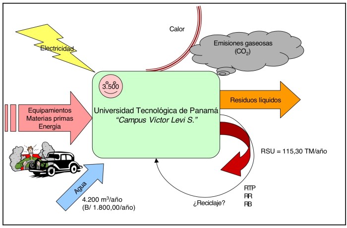 2. Campus universitario como ecosistema urbano. Tomar en cuenta los siguientes aspectos, conforme a la aplicación de la herramienta de gestión ambiental “Balanza de materiales y energía” (fundamentada en la Primera ley de la termodinámica …), la energía que entra al proceso (sistema) debe ser igual a la energía que sale.  Lo que no sale en forma de producto fue transformado en emisiones, efluentes y residuos, y puede (y debe), por ende, ser rastreado y registrado.  En la Balanza de Materiales y Energía se contabilizan: materiales, energías, productos, emisiones.
