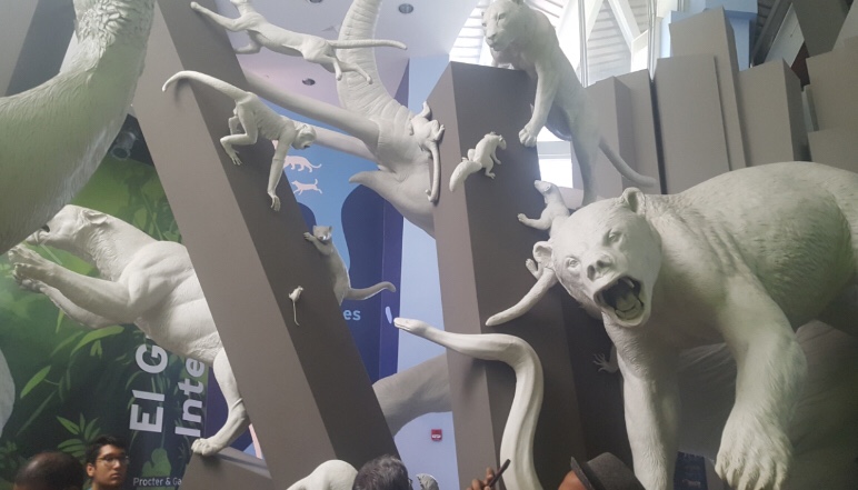 Luego, llegamos al salón “El Gran Intercambio” se nos explicó que cuando el istmo se cerró, se produjo un gran intercambio de especies entre Norte y Sudamérica. Observamos una estampida de esculturas animales que representan a 72 de las especies que empezaron a cruzar nuestro istmo desde hace casi 3 millones de años. Adicionalmente la separación de los océanos, provocó también que la fauna marina se dividiese, provocando adaptaciones nuevas especies del mar caribe y el pacífico. Este fenómeno coincide con un período de glaciación registrado en esa misma época.