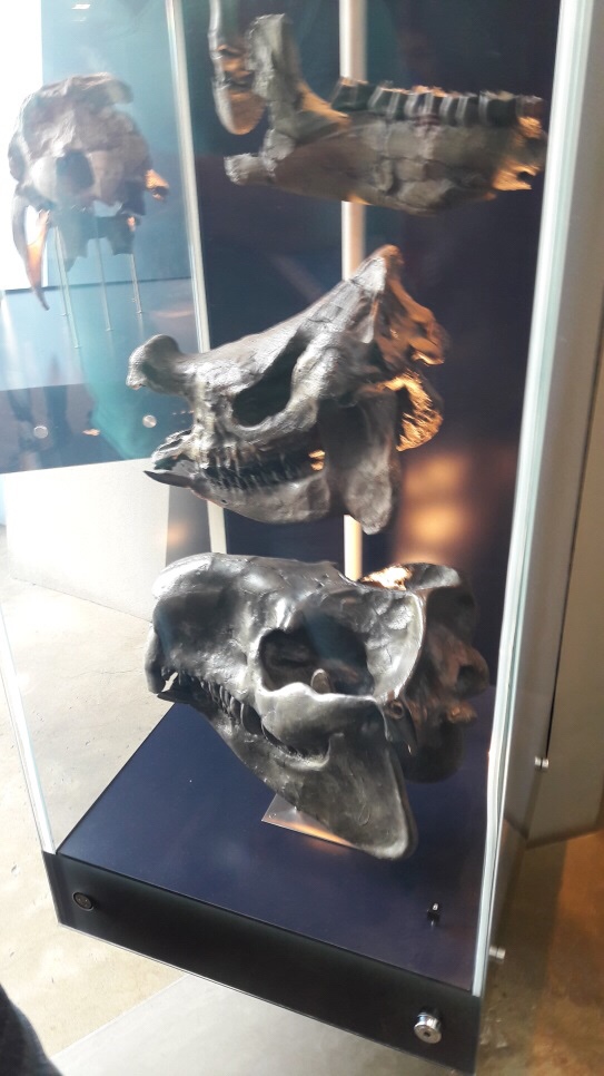 Después de esta explicación de parte de nuestro guía, de cómo surge el istmo de Panamá nos movilizamos hacia otra sala: El Gran Intercambio. Nos continúa explicando que una vez se forma el istmo, se crea una forma de puente entre América del Norte y América del Sur y empieza a ocurrir una migración de animales, de norte a sur y viceversa. Podemos observar en las vitrinas fósiles de animales que vivieron en esa época y que ya se extinguieron.