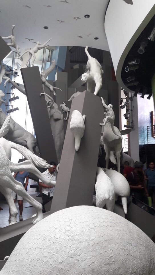 Ya terminada la visita a esta sala, subimos las escaleras y llegamos a una sala donde se exhibían unas maquetas del Biomuseo. La profesora aprovecho para reunirnos e intercambiar opiniones sobre el recorrido hecho hasta el momento.