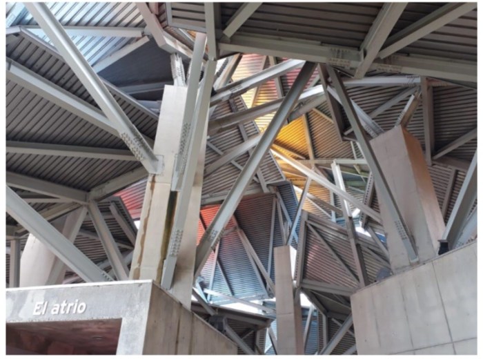Las vigas del atrio del edificio -que se encuentran debajo de las planchas de colores- están construidas como si fueran un bosque tropical o una desordenada telaraña blanca y cada una soporta una sección del techo.