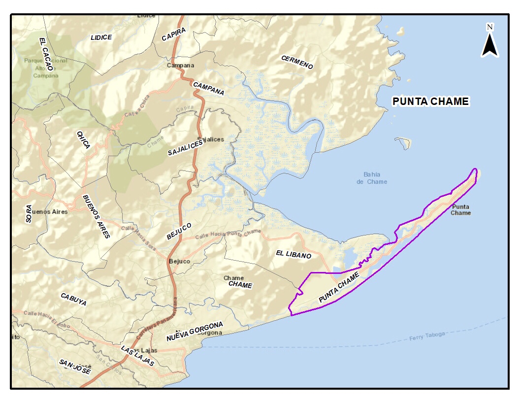 El poblado de Nueva Gorgona se encuentra ubicado en el corregimiento de Nueva Gorgona, distrito de Chame, dentro de la provincia de Panamá Oeste. La zona costera se encuentra bordeada de complejos habitacionales y residencias, y se caracteriza por tener una arena de color negro, con altas concentraciones de hierro (figura 1).