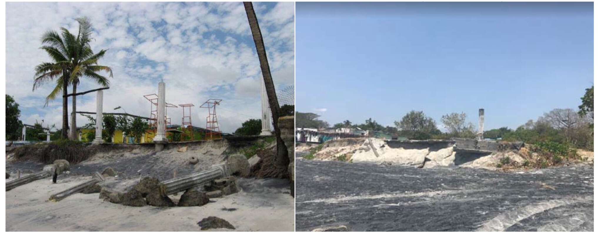 - Logramos observar cómo el mar, a través de procesos erosivos, ha ido reclamando terreno a lo largo y ancho de las construcciones existentes (figura 9). Se ha demostrado que los muros de contención, por diseño, técnicas constructivas y materiales, son altamente vulnerables.
