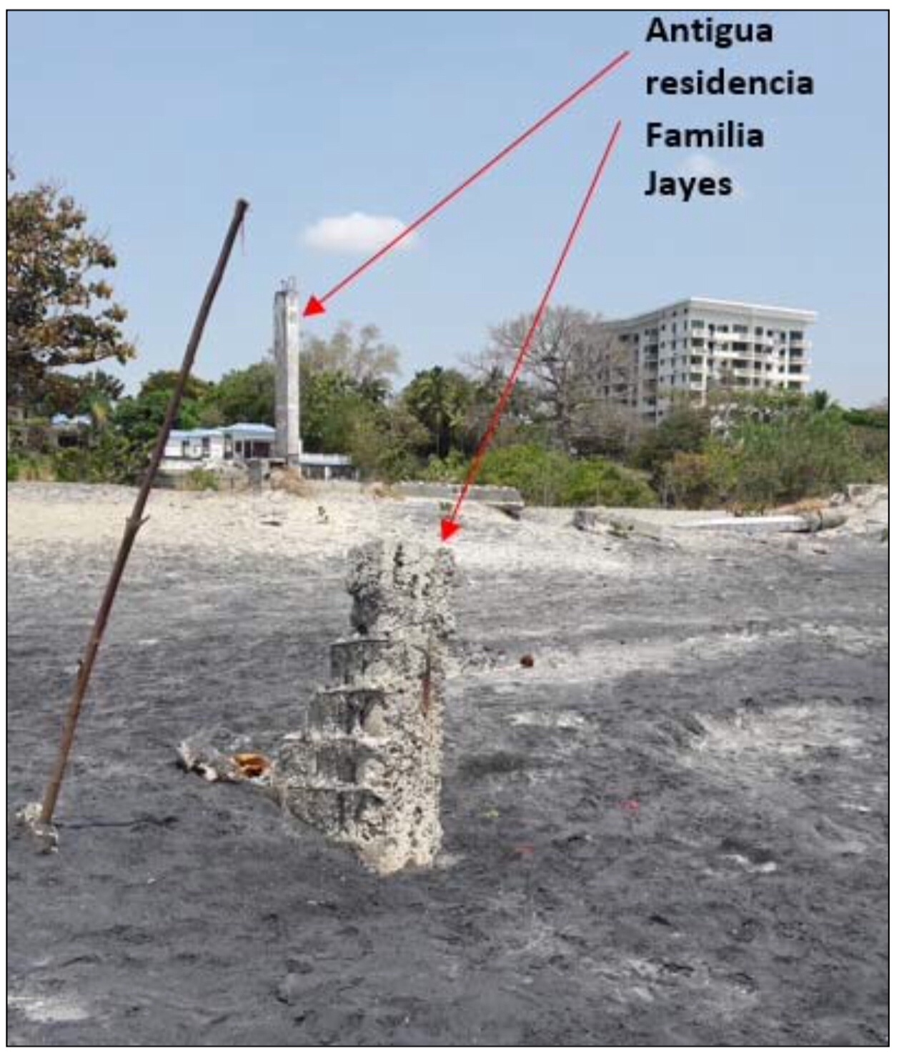 - Pilotes enterrados en la arena, zona litoral de la playa; vestigios de lo que en algún tiempo fue un muelle (figura 4). Los moradores comentan que antes el mar estaba tan retirado que debían utilizar esta facilidad para abordar las embarcaciones.
