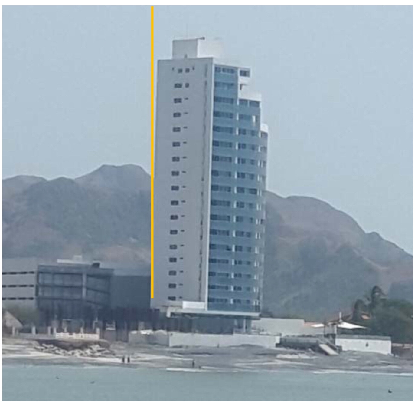 Nos comentaba el Sr Daniel de manera jocosa que el edificio de la imagen superior, él consideraba que en unos cinco años el mar lo habría hecho colapsar. Nos expresaba que este edificio está asentándose y que se podía notar la pequeña inclinación que mostraba, para lo cual nos dimos la tarea de tomar una foto lo más vertical y estable posible para mostrar dicha inclinación. Puede ser que solo sea un efecto óptico por la distancia que se encuentra hasta la costa pero si se percibía esta ligera inclinación.