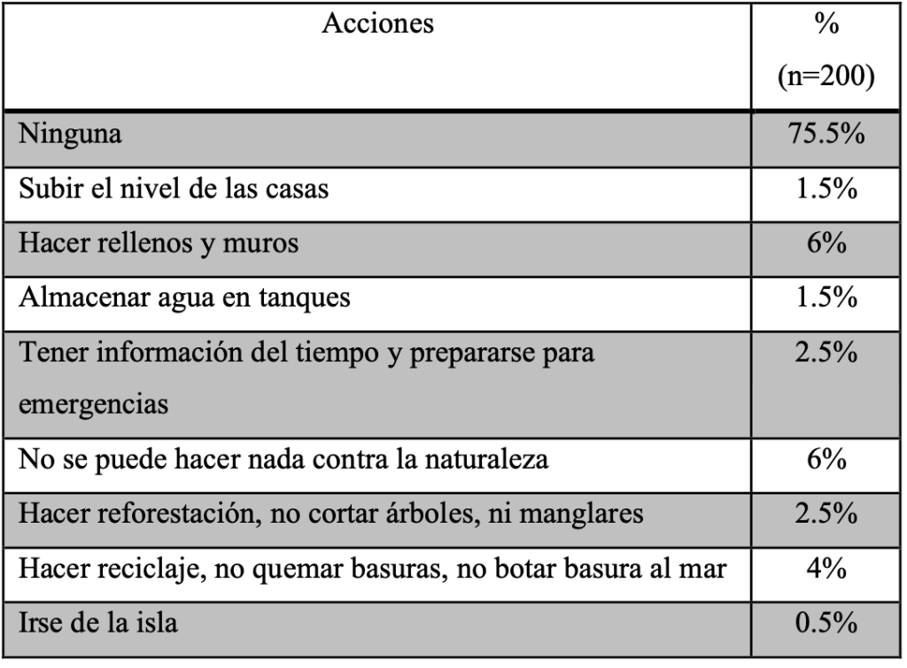 Los principales eventos de peligro percibidos como un riesgo para la comunidad fueron la erosión costera, las inundaciones costeras, las marejadas y las tormentas.