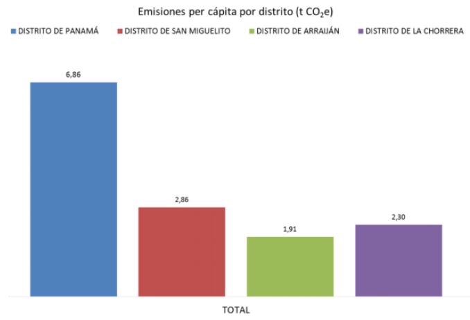 Al igual que para el área de estudio completa, se ha realizado un análisis de las emisiones del año 2013 por distritos. En la figura 31 se pueden apreciar los resultados per cápita de cada distrito. El mayor balance de emisiones per cápita está asociado al Distrito de Panamá con 6,86 t CO2 e/hab, siendo los balances de emisiones per cápita de los otros tres distritos restantes significativamente inferiores a la par que similares entre sí.