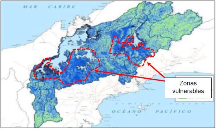 Figura 1. Zonas vulnerables a inundaciones en Cuenca del Canal de Panamá (1970-2010).Fuente: Mi ambiente, 2013)