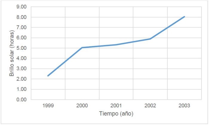 De esta gráfica podemos extraer que la las precipitaciones tuvieron un aumento en el año de 1996, con 9mm en promedio ese año; de igual forma, este año se dio la mayor precipitación con un número de 3500mm ese año. La tendencia muestra que éstas están en aumento. Lastimosamente, las estaciones activas en esta cuenca, iniciaron su actividad hace poco tiempo y no almacenan una cantidad de registros y esto representa un sesgo en el análisis de los datos. Otra variable analizada corresponde a la cantidad de radiación solar en horas sobre la cuenca, como se muestra en la siguiente gráfica:
