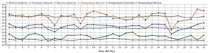 Figura 11. Registro de temperatura diaria en octubre de 2016 y datos históricos (Hidrometeorología, ETESA).