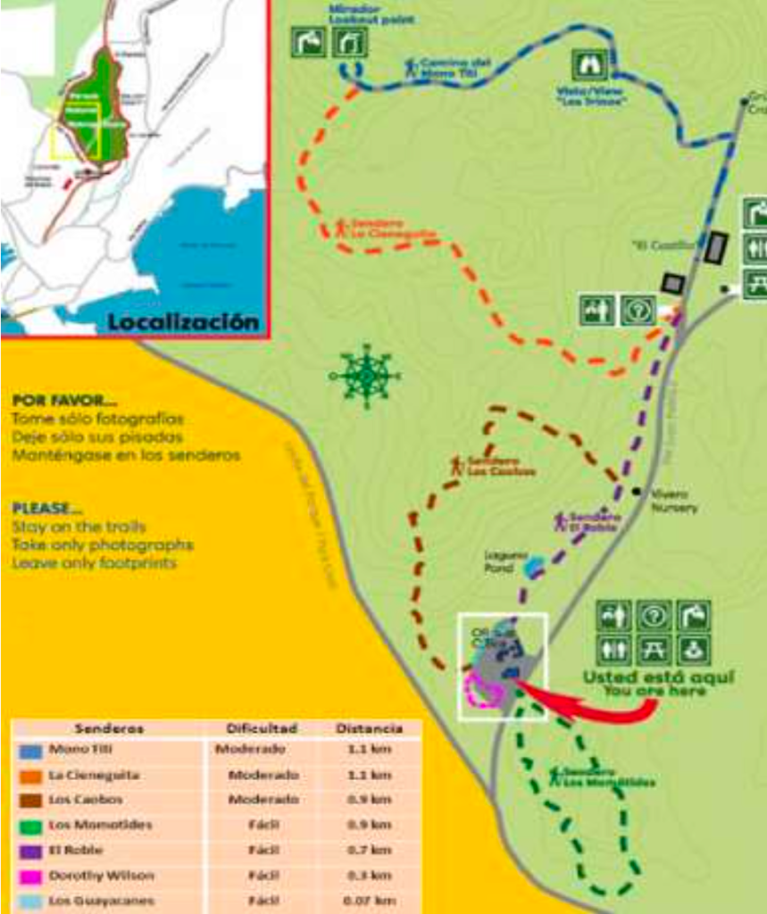 El grupo se reunió en el centro de visitantes donde se estableció de forma breve y concisa las normas y lineamientos que se debían adoptar al entrar en la zona boscosa del Parque. El trayecto de gira empezó por el sendero Los Caobos. Una vez dentro del área boscosa, la Dra. Marilyn Diéguez explicó las características observables de la vegetación por el sendero. Se mencionó la importante caracterización de bosque secundario tropical seco. Se hizo referencia a que en los bosques tropicales hay pocos individuos de una misma especie pero muchas especies (mayor diversidad).