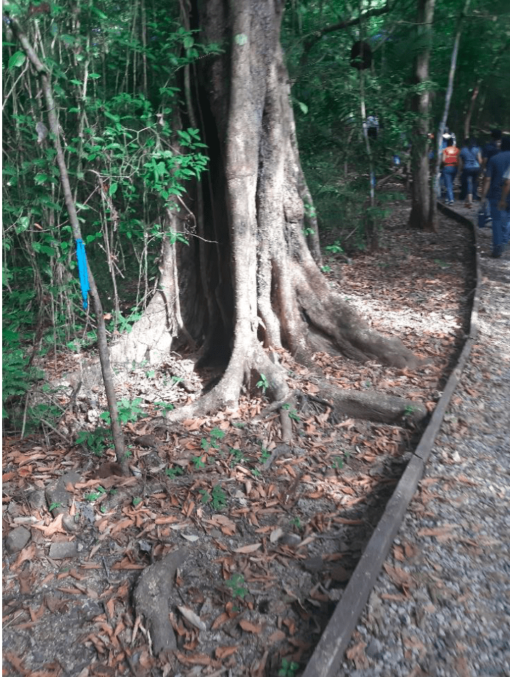 En algunos árboles, próximos al sendero, se podían ver las raíces cortadas de árboles por donde pasaba el cordón marcado del sendero, obras realizadas por el ser humano. Esto aumenta la vulnerabilidad del árbol al afectar su capacidad de fijación o amarre al suelo. Las raíces ayudan a sostener el árbol para que no se caiga y son igual de grandes que la parte del árbol que sobresale (copa del árbol: ramas y hojas).