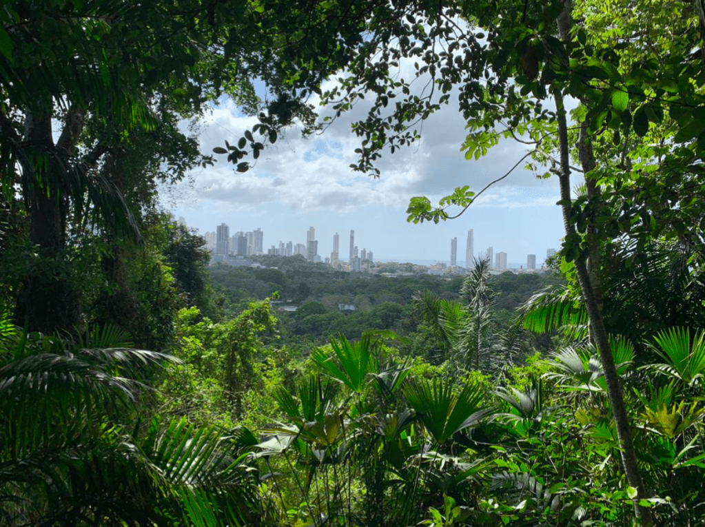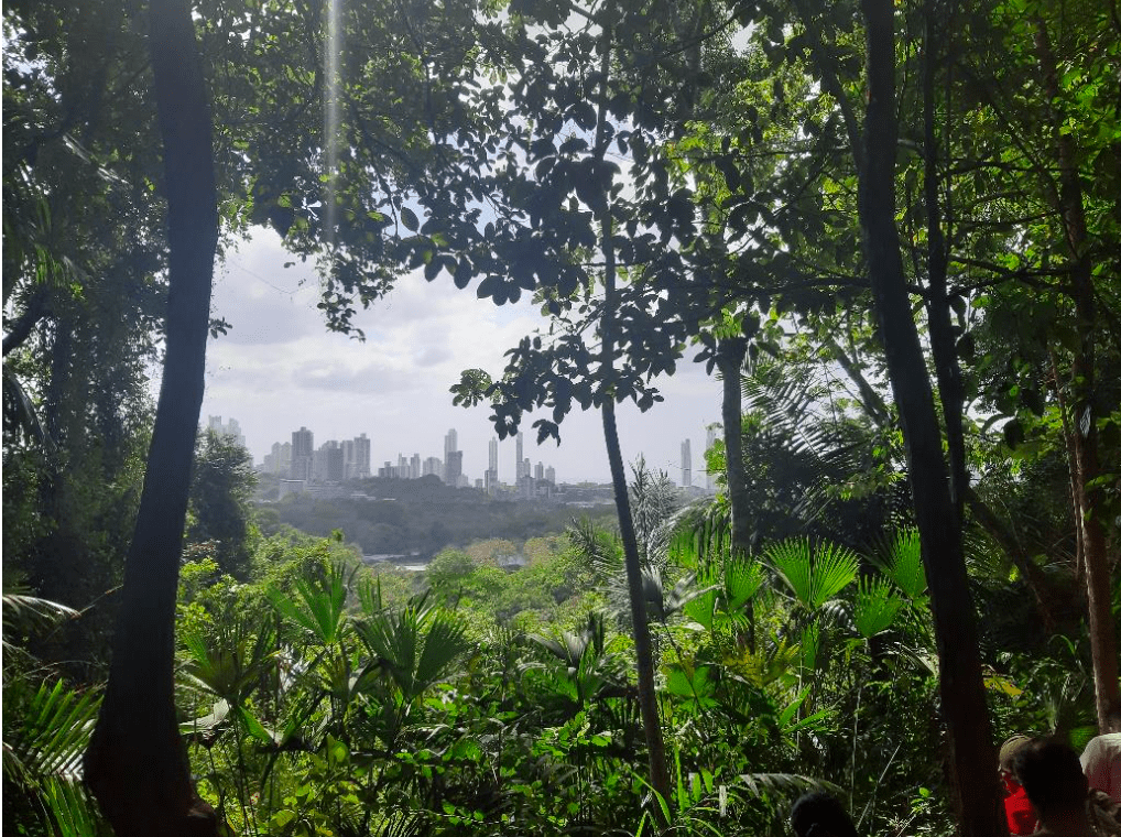 Al llegar al mirador se observaba una linda vista de la ciudad, haciendo contraste de las edificaciones y el bosque en medio de la cuidad. En este lugar observamos la planta que se usa para la elaboración de los sombreros típicos de Panamá, conocida comúnmente como planta de bellota o