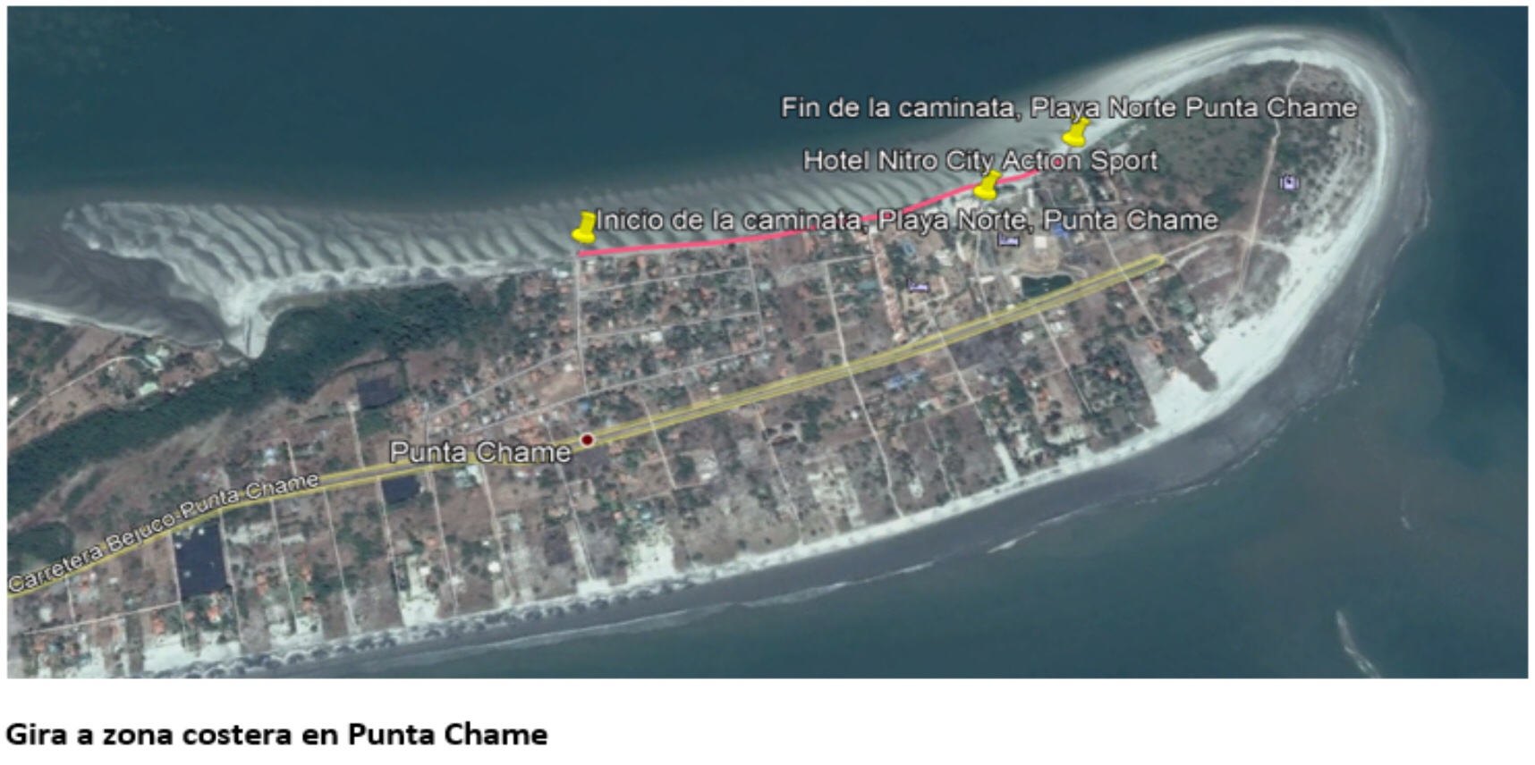 Las imágenes a continuación, obtenidas del programa Google Earth Pro, muestran una evidencia cronológica de los cambios que ha sufrido el terreno de Punta Chame y su única ruta de acceso a través del tiempo. El cambio en la zona costera muestra como se ha perdido o se ha recogido el terreno, dándole más espacio al mar, sin embargo, también la zona de la carretera, específicamente en Claridad se ha vuelto más angosta. En la parte de los manglares se percibe que se ha mantenido su superficie en gran medida.