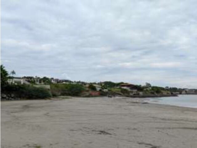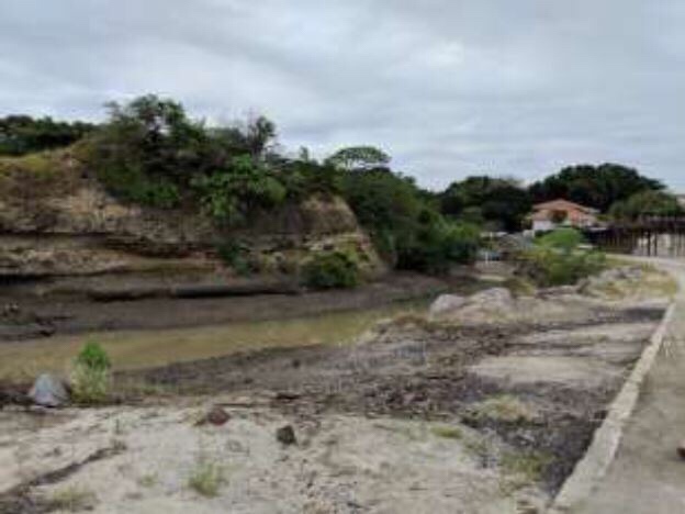 Parte de la costa frente a un local donde los desechos como las ramas traídas por el mar sirven para mitigar el efecto de las olas. Adicional se observa que la maleza no ha sido removida para evitar dejar expuesto el suelo y que el mar siga socavando.