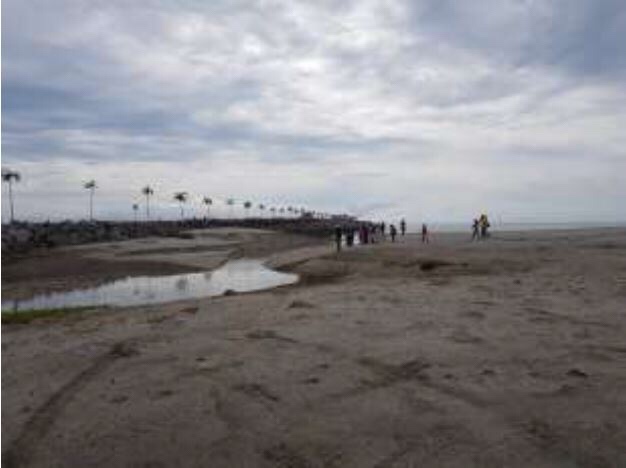 Inmediatamente una brisa fuerte nos recibió y acompañó durante el resto de la caminata. Se nos indicó que esta parte es la que colinda con la bahía de Chame, desde donde se puede apreciar isla Taborcillo, cerro Chame y cerro Campana. Aquí el mar se observa tranquilo, oportuno para bañarse o nadar. Al buscar la forma de la línea de costa se observa que es casi recta, con varios botes pesqueros artesanales encallados en la arena de la orilla, por lo que deducimos que la pesca es una de las actividades a la que se dedican los habitantes. Vimos también que existe una especie de muro o talud conformado por piedras de gran tamaño y concreto, que separa el nivel de la playa actual del nivel de las casas, restaurantes, hoteles y lotes que están en la costa. Continuando la caminata por la orilla vimos varios vástagos de árbol de mangle, sin embargo no vimos ningún árbol de mangle o bosque de mangle cerca a esta parte de la playa.